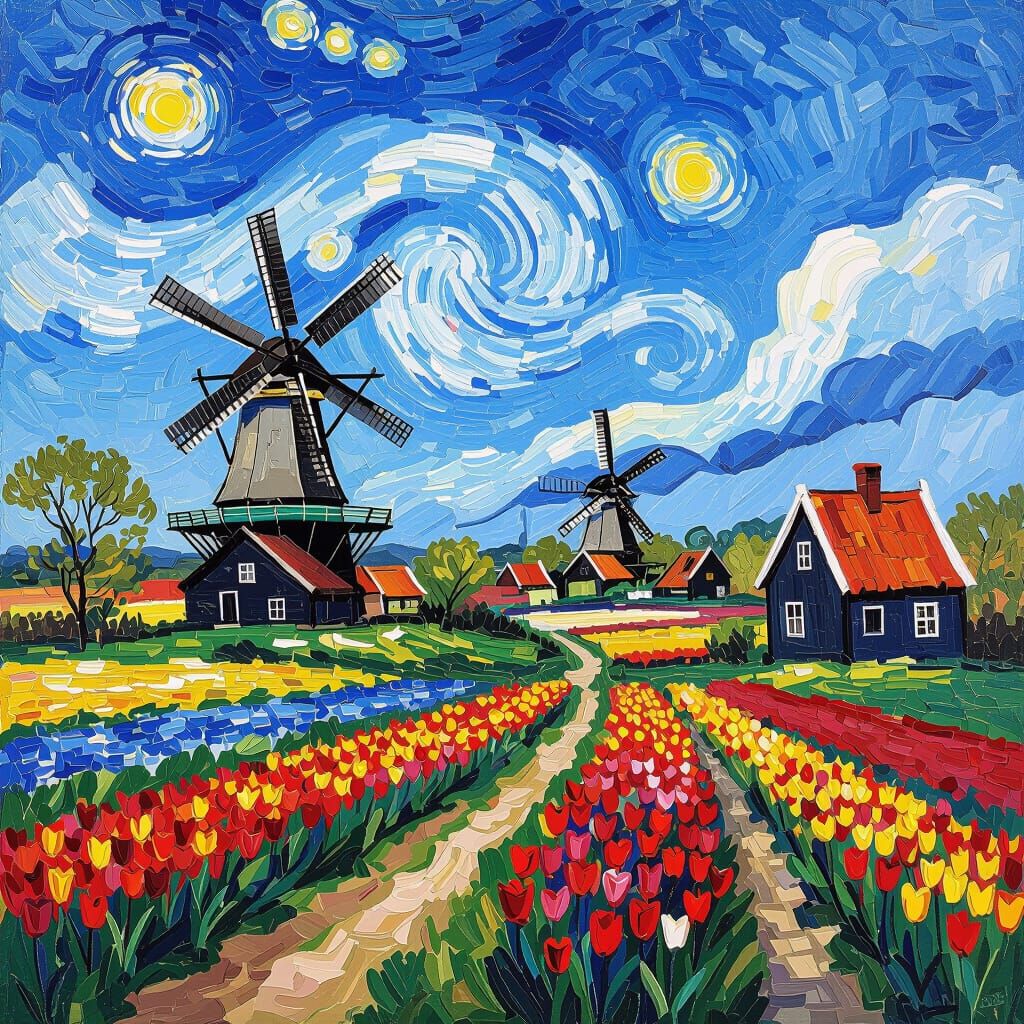 A vibrant painting of the Dutch countryside, featuring windmills, tulips, and traditional houses. The scene evokes post-impressionism with textured brushstrokes and a swirling sky, reminiscent of a Van Gogh painting.