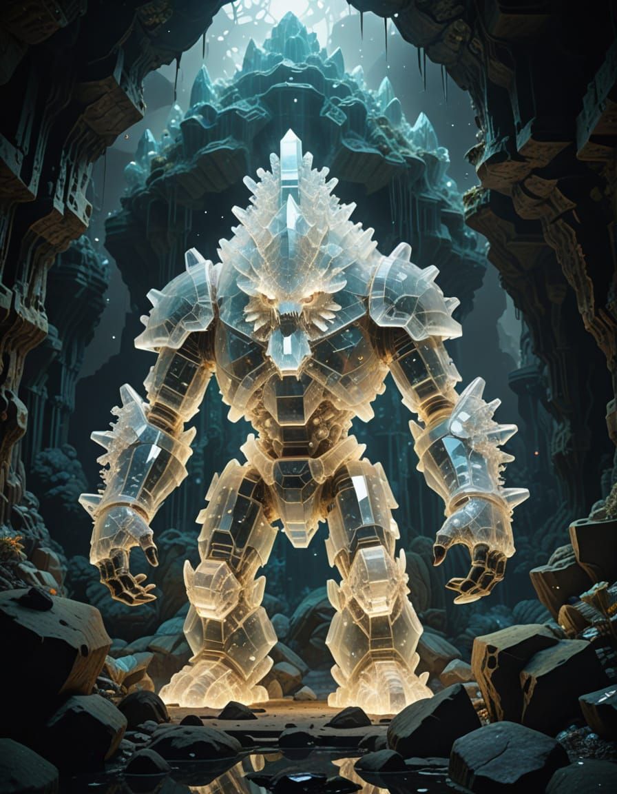 A striking picture of a crystal golem in a hidden grotto. The golem is made of translucent quartz with fractal patterns, set against mist and ruins in vivid colors.