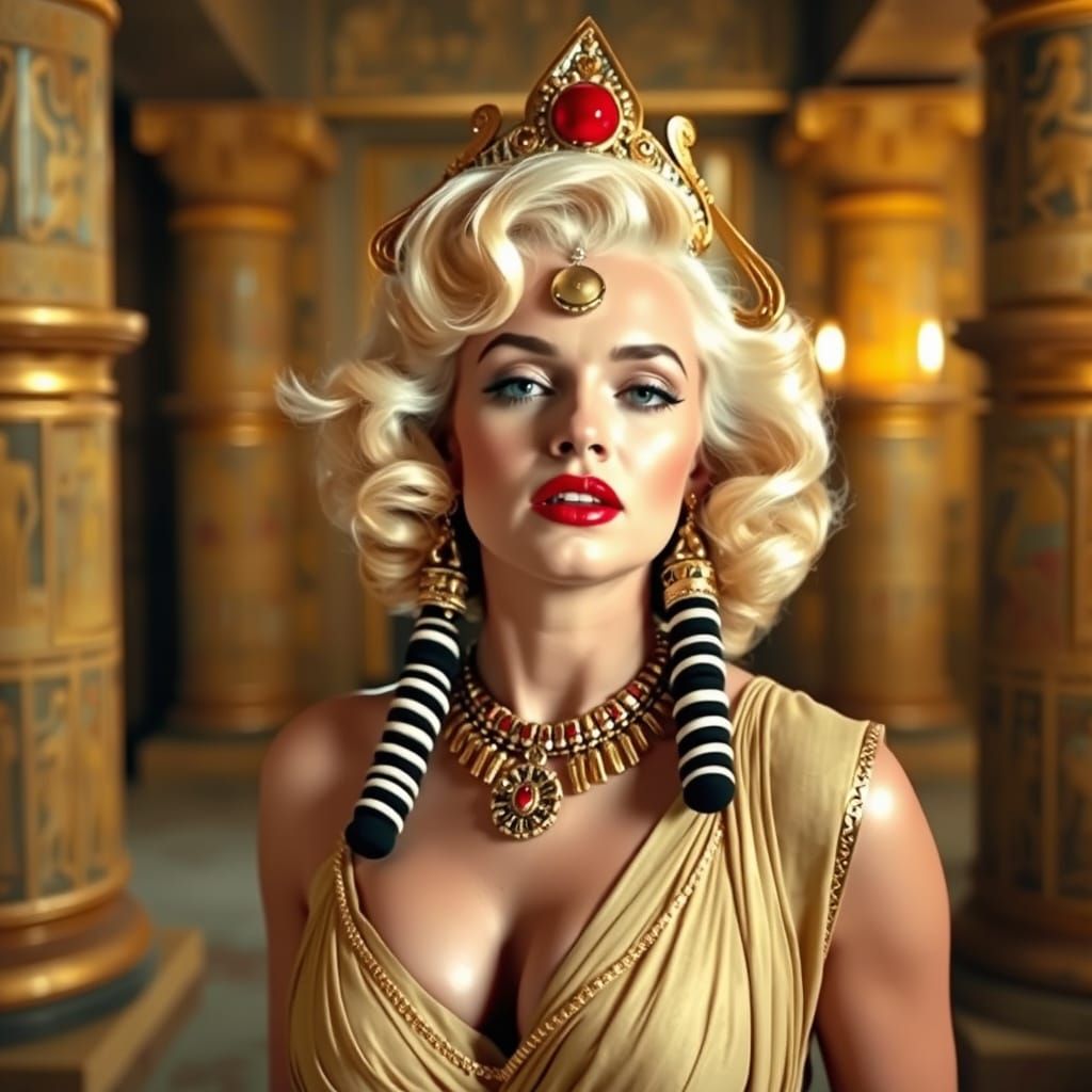 This image shows Marilyn Monroe costumed as Cleopatra in an opulent Egyptian temple. The artwork evokes classic Hollywood glamour in an ancient Egyptian setting.