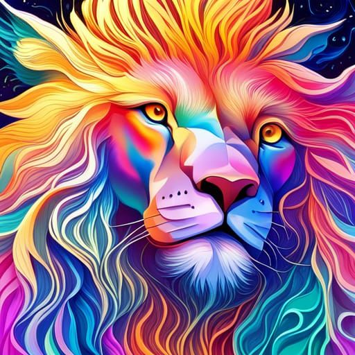 This image shows a vibrant paper sculpture of a lion. The artwork features holographic and cosmic elements in a mixed media illustration, reminiscent of astral art.