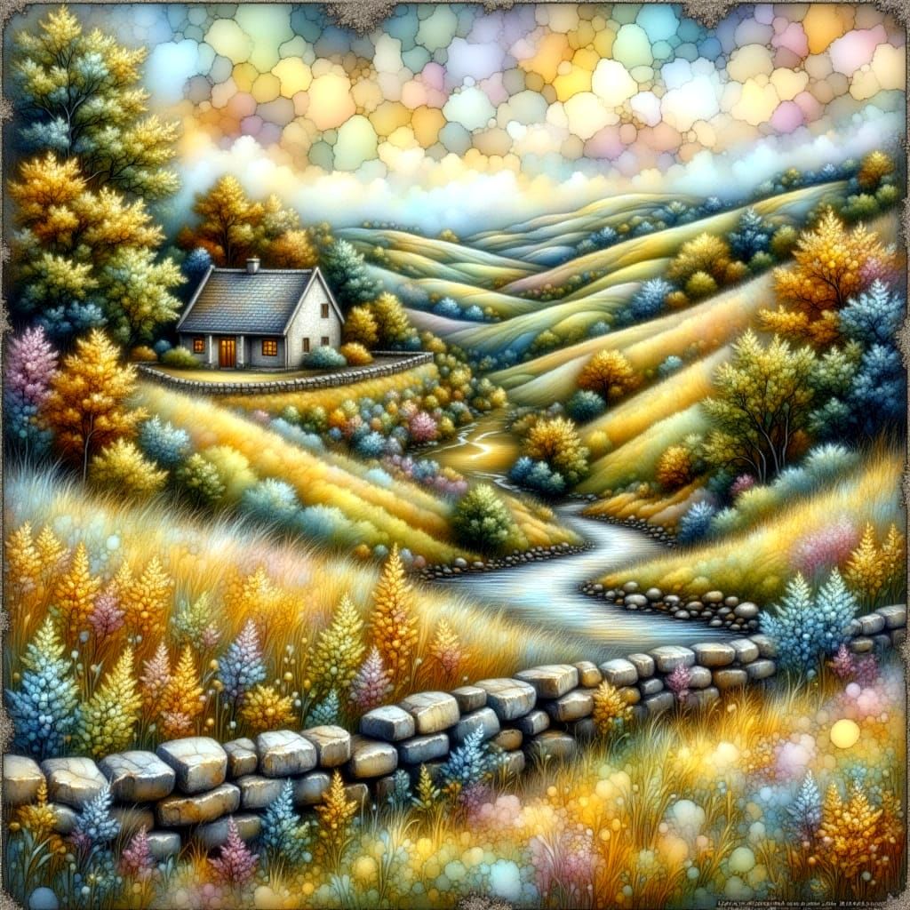 This image captures a serene English spring landscape with rolling hills, wildflowers, and a rustic stone tavern, set amidst a picturesque natural scene with soft pastel hues and subtle bokeh effects.