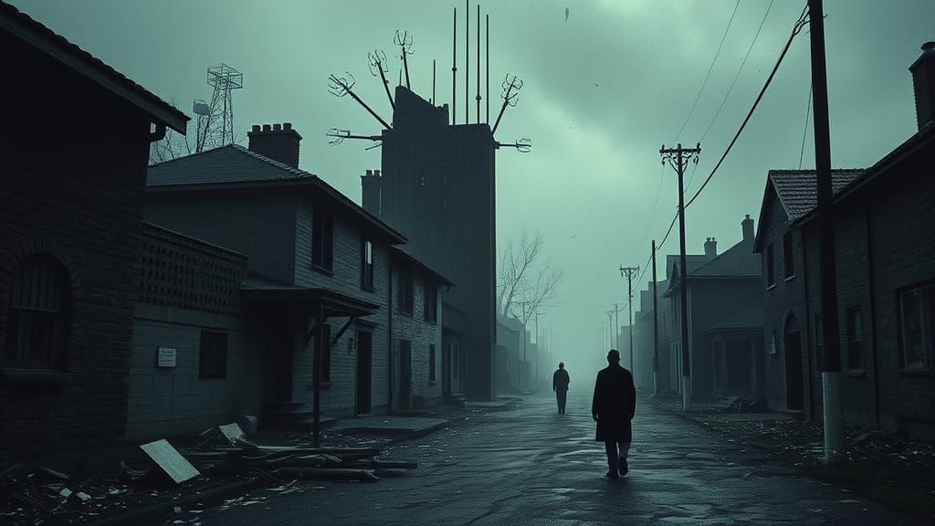 This image shows a mysterious figure, dressed as a monk, with a hint of a smile, amidst a desolate landscape. The artwork combines elements of cyberpunk and dark fantasy aesthetics.