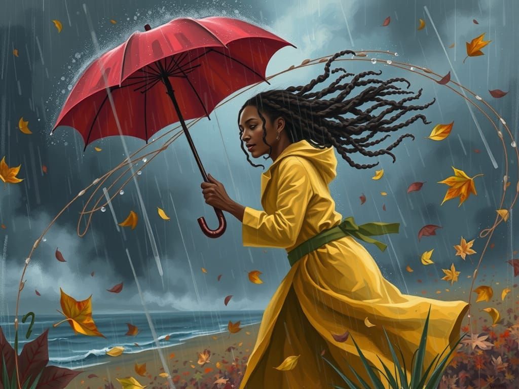 This striking image shows a Black woman in a yellow raincoat with an inverted umbrella, battling a stormy autumn wind. Painterly brushstrokes capture the dynamic movement of her hair, leaves, and turbulent sky.