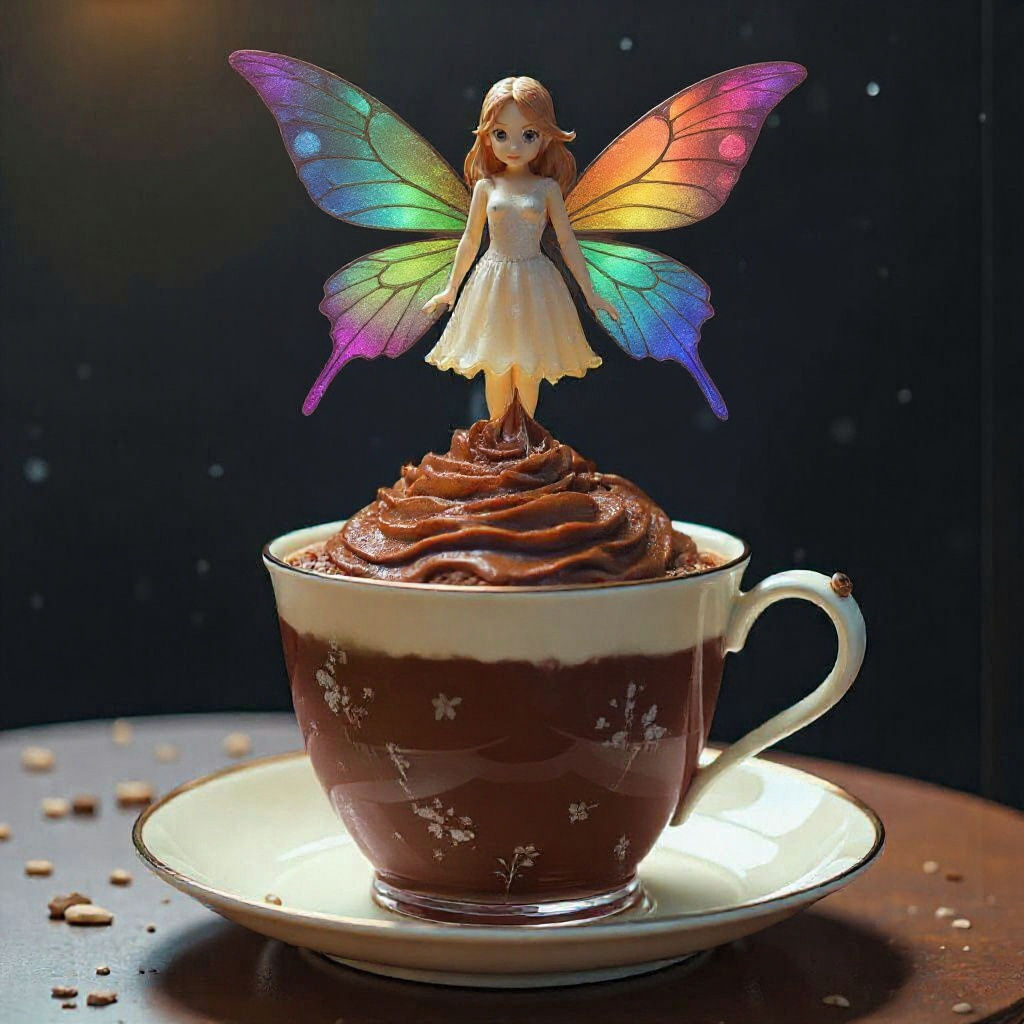 A surreal image of a steaming cup of hot chocolate. The steam transforms into a fairy with vibrant, translucent wings, set within a fantastical, modern art style.