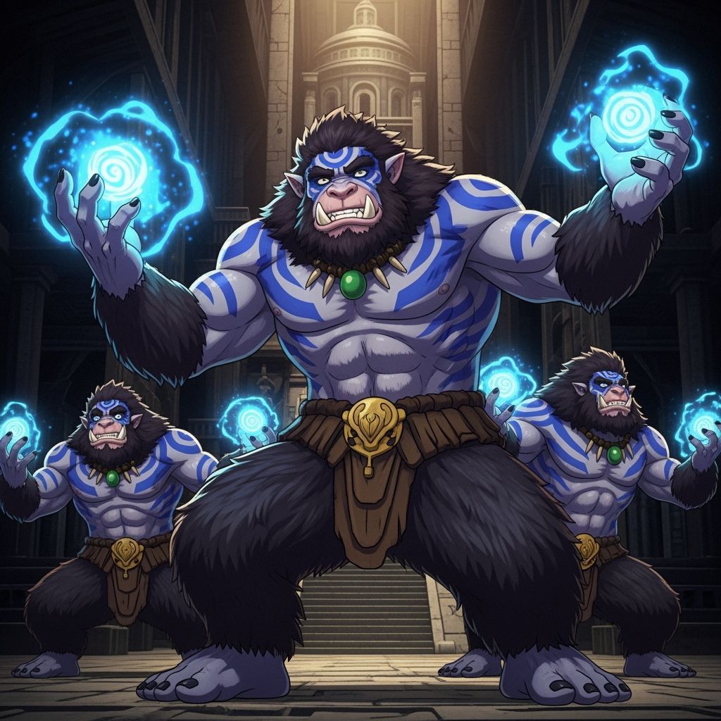This image shows robust Neanderthal-like beings with blue and violet markings, exhibiting bio-elemental powers in ancient underground cities. Rendered in a cinematic anime style with deep colors and cel-shaded textures.