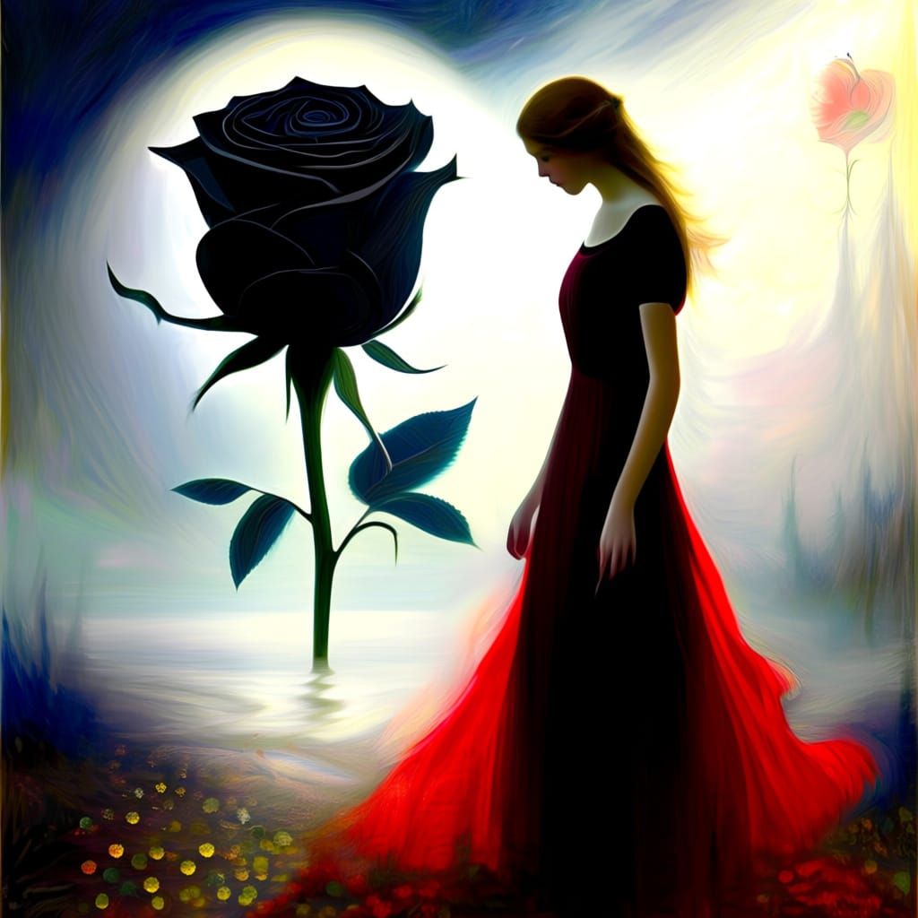 A solitary black rose floats in a dreamlike world with a girl in a flowing scarlet dress. Rendered in a painterly style with dramatic lighting and rich colors.