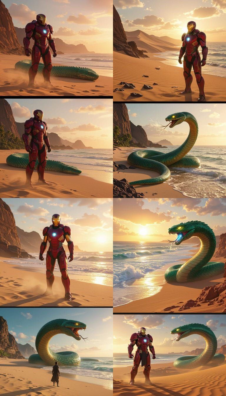 This image depicts a surreal desert landscape merging with a tropical island under a warm sunset sky. Features include a futuristic warrior and a giant titan snake, rendered in ultra-realistic detail.