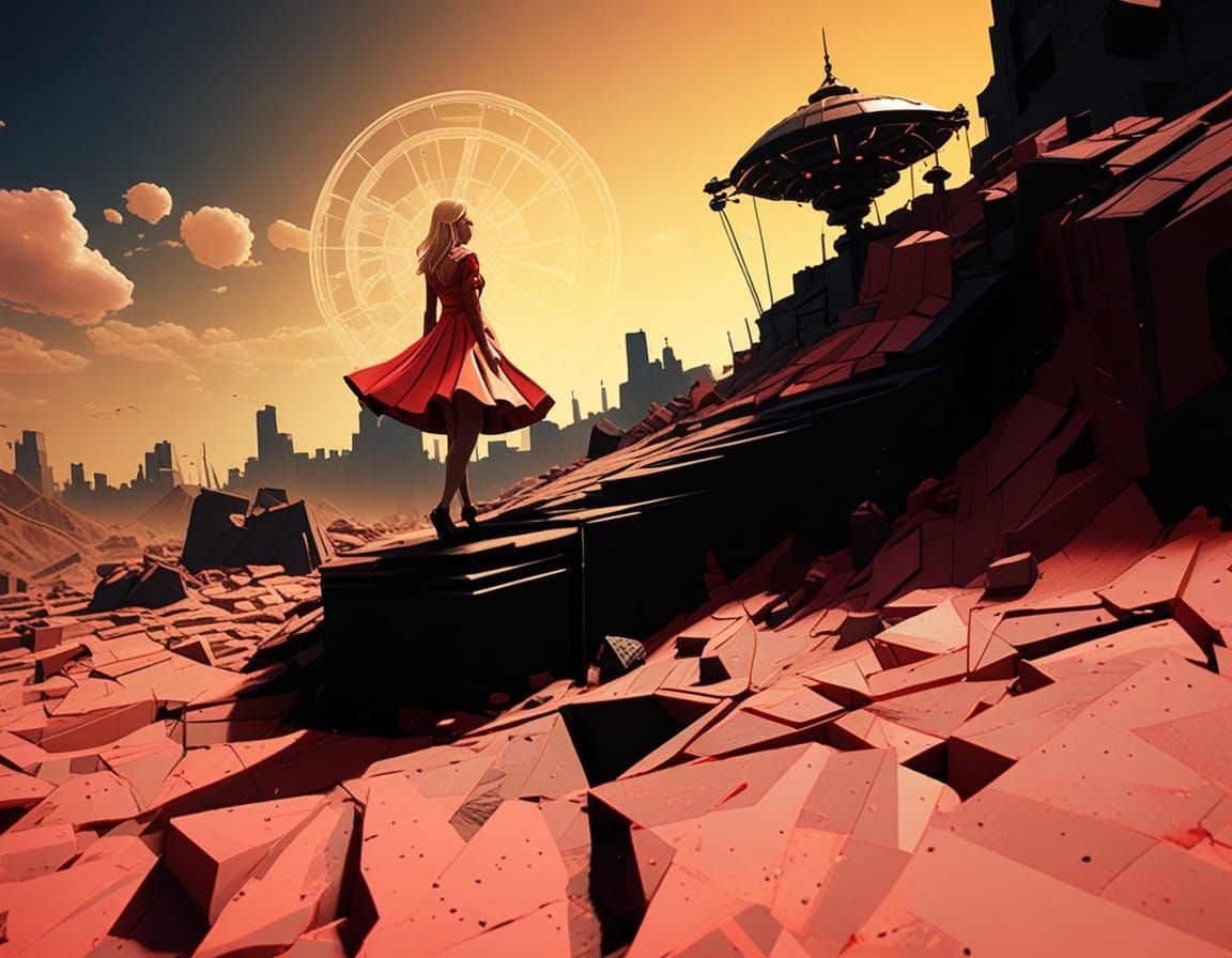 This image shows a woman walking away from a dark, futuristic landscape filled with smoke and rubble. The scene is rendered in a vibrant street art style with strong backlighting.