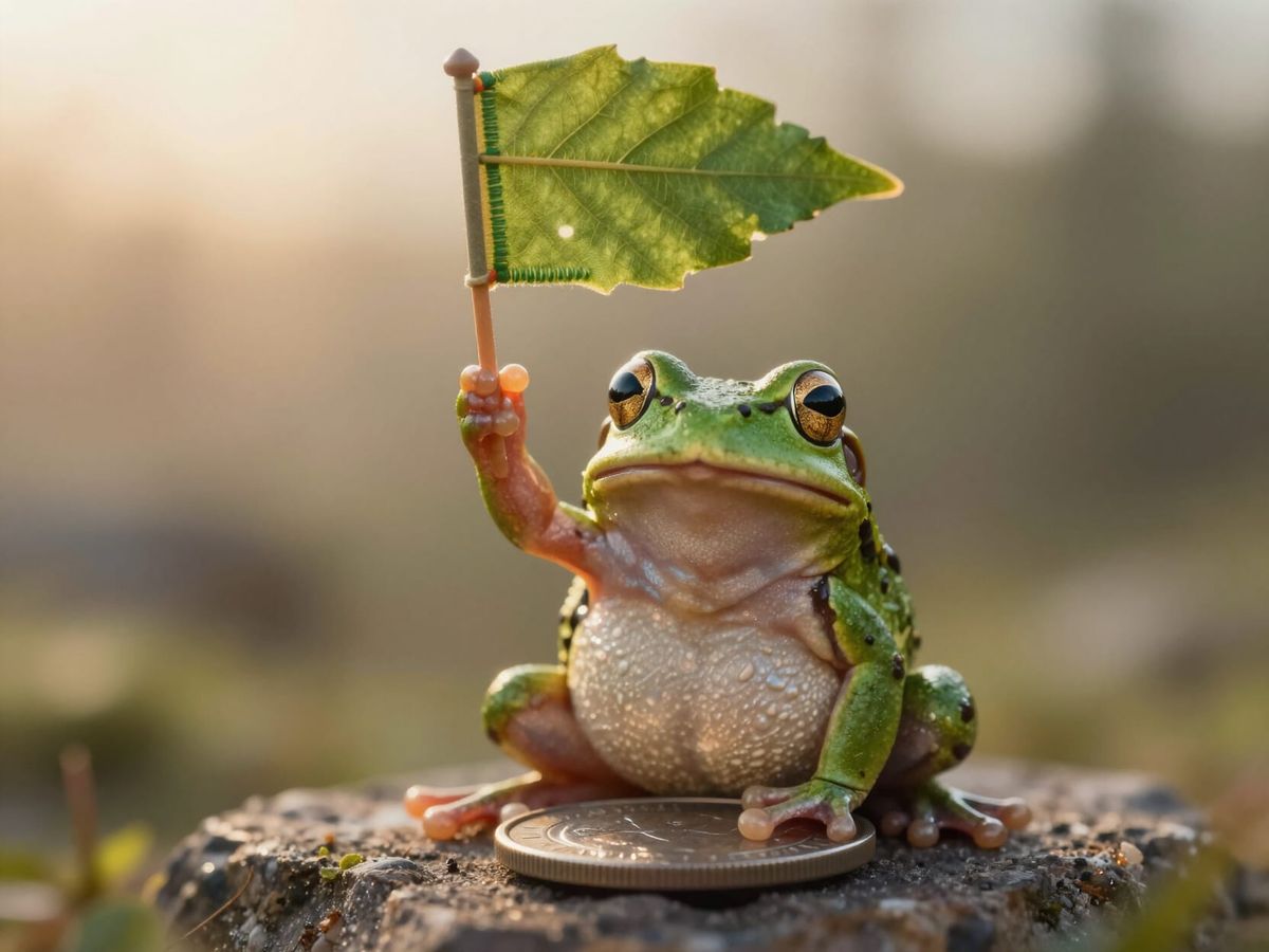 A detailed macro photograph of a tiny frog victoriously planting a leaf flag on a coin, bathed in warm sunrise light with cinematic lighting.