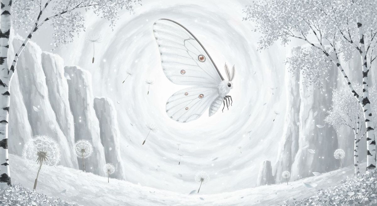 A striking picture of a giant white moth with shimmering wings, set against a swirling sky. Dandelion seeds drift in the air, illuminated by silver light, in a painterly and magical style.