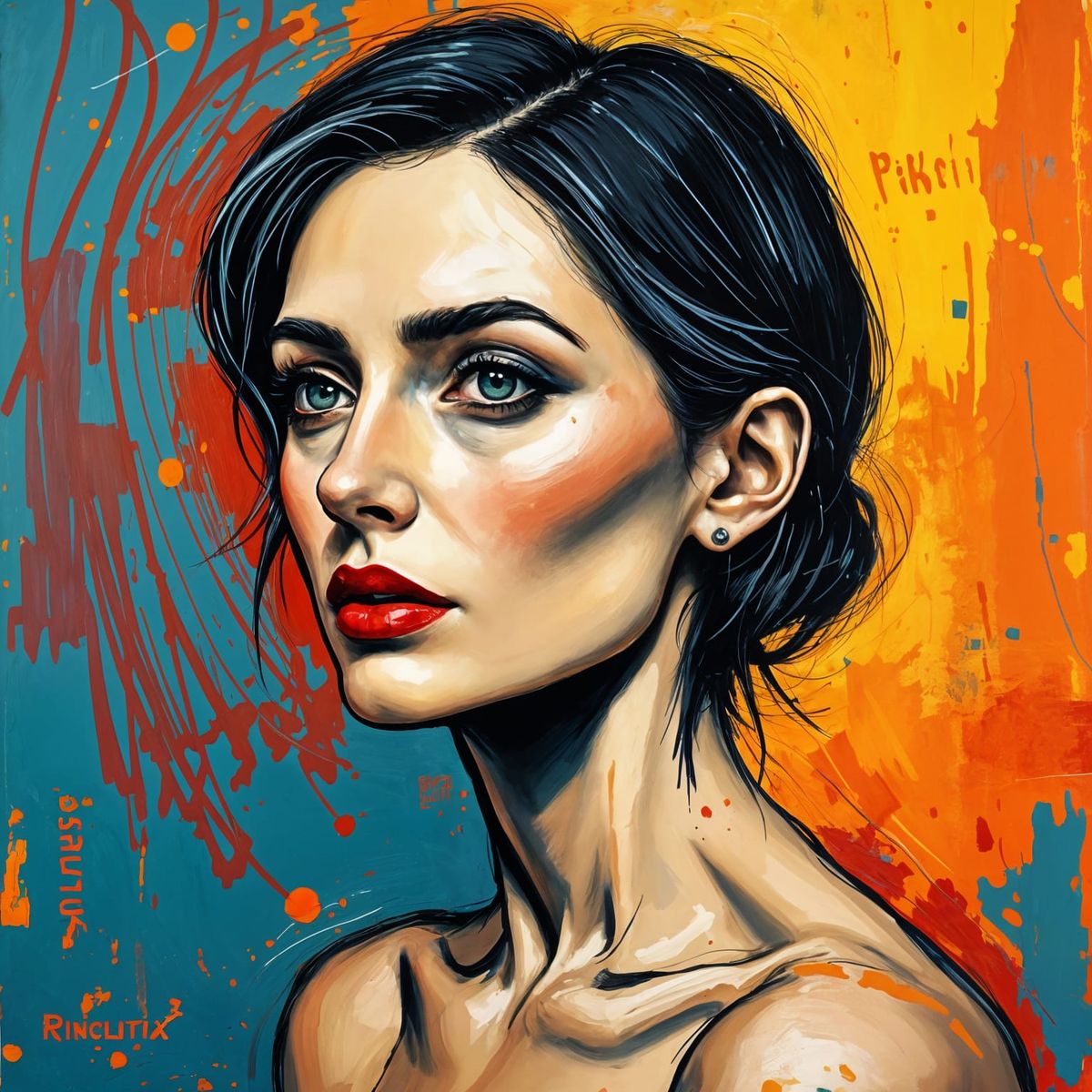 This image is a vibrant oil painting of a slender woman with a striking neo-impressionist expression, created using thick layers of textured paint in a post-impressionist style.
