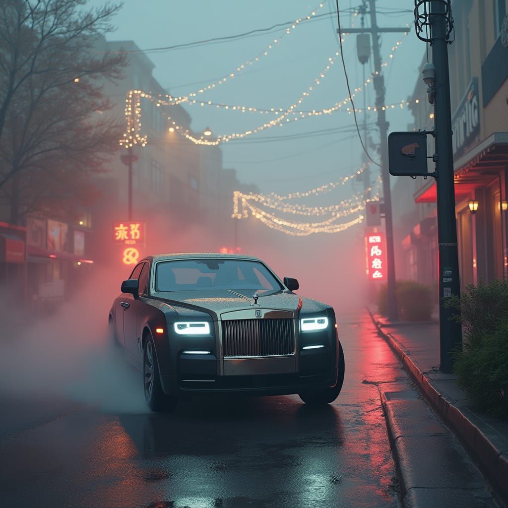 This image shows a Rolls Royce drifting through misty city streets. The car is adorned with Cartier accessories, in a surreal blend of trap culture and luxury. The image is rendered in a dreamy, surreal style.