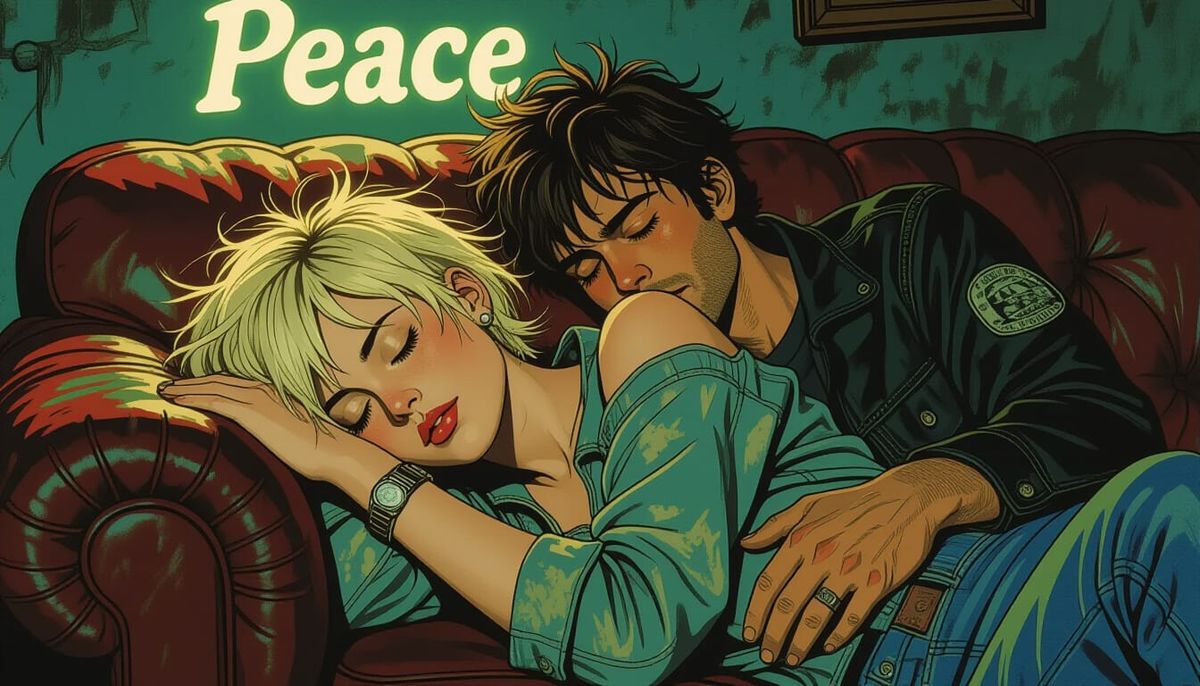 A close-up image depicts a blonde skater woman sleeping on her boyfriend's lap. The scene, illuminated by a soft glow, blends gritty textures with ethereal surrealism, using dramatic shadows to create a moody atmosphere.