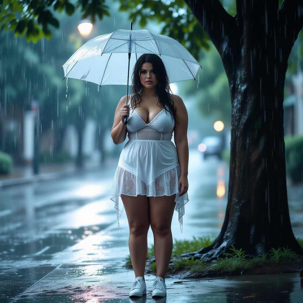 This image shows a young woman in a wet dress standing under a tree during a heavy rain. The cinematic shot emphasizes the atmospheric conditions and dramatic lighting.