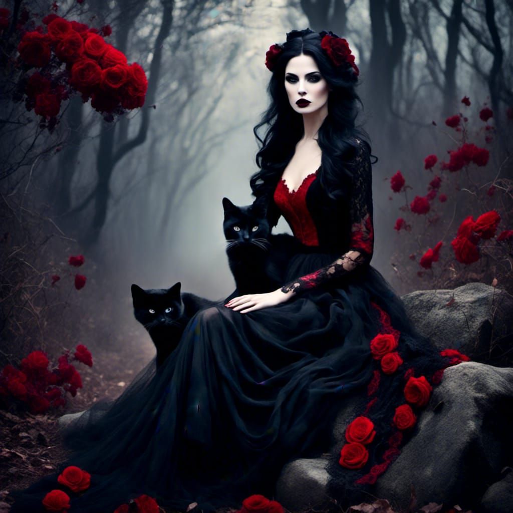 A striking picture of a gothic woman with dark makeup and attire, seated on a rock in a misty forest with her gray cat. Her style blends watercolor techniques with dark and elegant elements.