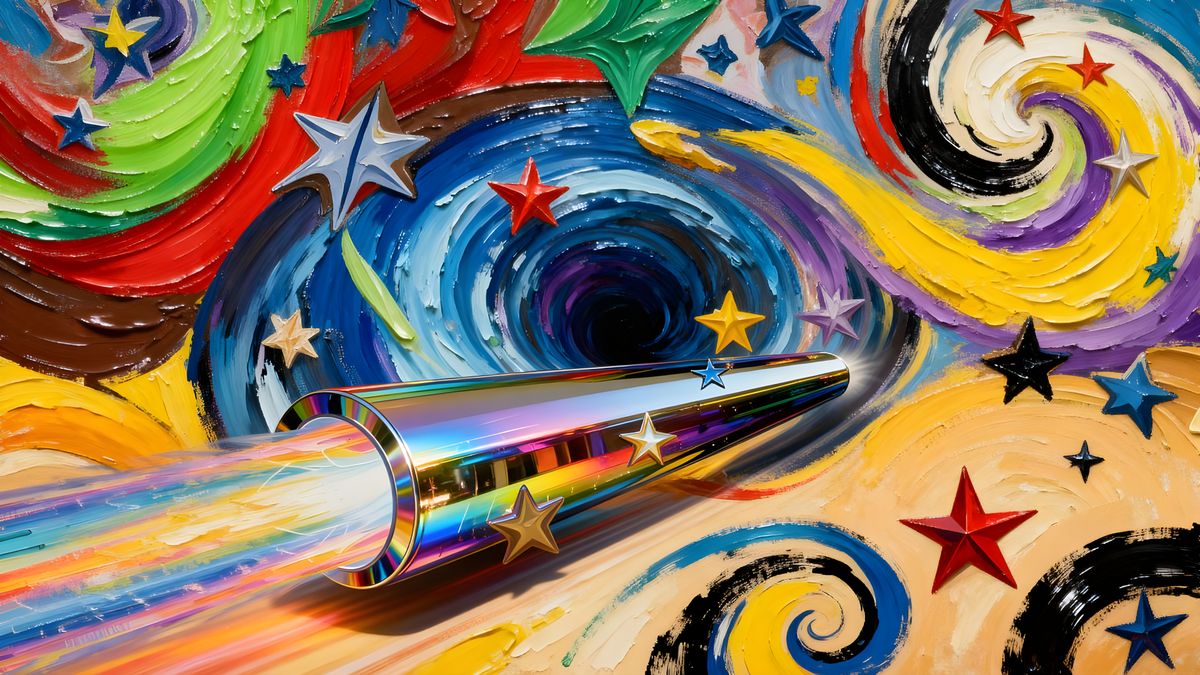 This image features a sleek, rainbow-enamel cylinder with a high-velocity iridescent exhaust. It mirrors a dynamic 3D vortex of thick, impasto oil paint and swirling stars in vivid colors.