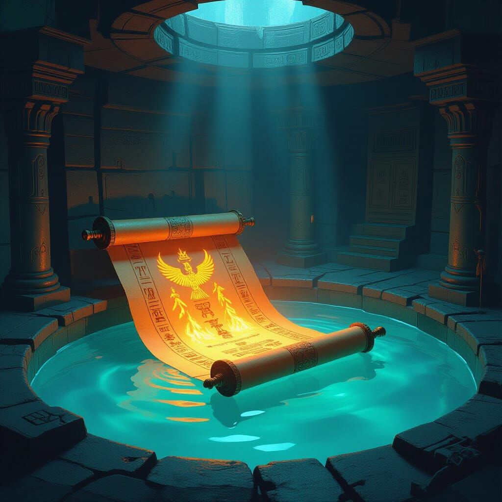 A hidden chamber is revealed beneath a luminous pool, containing an ancient scroll adorned with fiery symbols and sealed with golden wax. The image has a futuristic realism aesthetic.