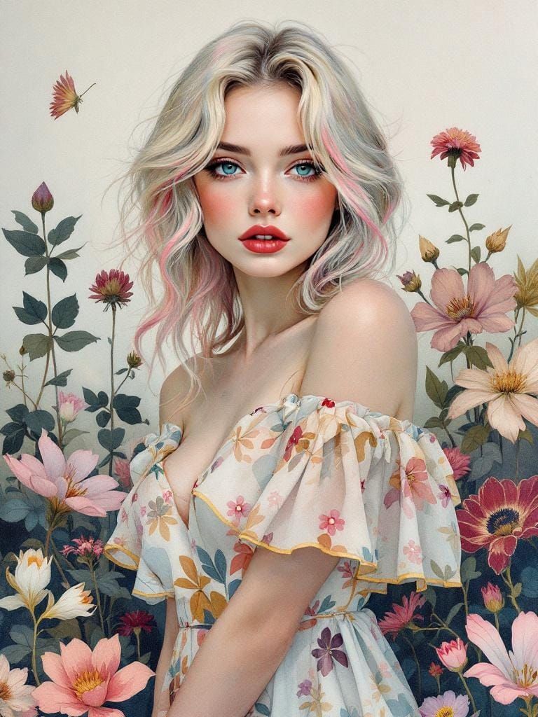 A captivating image of a pin-up woman with pink-tipped hair, rendered in an Art Nouveau style. The artwork features delicate lines, flowing colors, and organic compositions reminiscent of watercolor paintings.