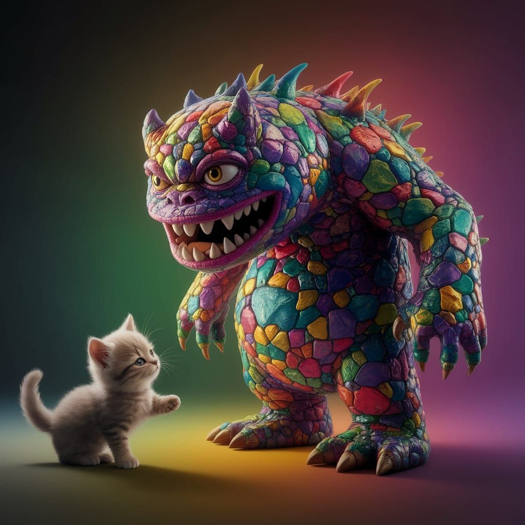This image depicts a colorful, stone-mosaic monster attempting to intimidate a playful kitten, set against a dynamic, textured background that highlights the intricate details of the monster's design.