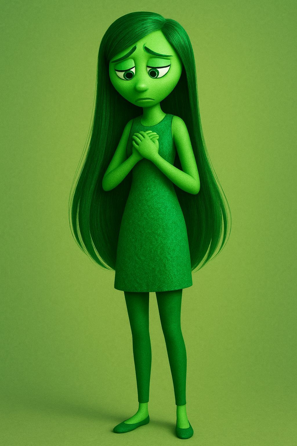 This image features a tall, adult female character with long, emerald green hair and skin, embodying empathy. She is depicted in a caring pose with hands over her heart, rendered in the style of Pixar's Inside Out.