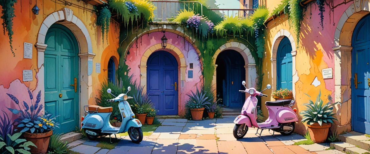 A digital rendering of abandoned passageways with benches, depicted in a watercolor and gouache style. The scene features a white Vespa, mossy stone walls, and bright daytime sunlight.