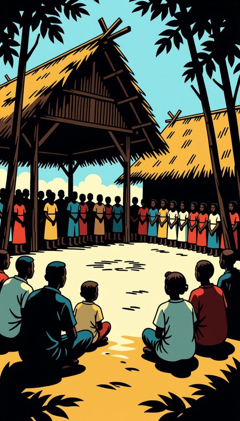 This image depicts a village gathering of 300 people, men in front, women and children behind, under a leafy roof. It features a disjoined rhythm, opaque texture, and tetradic colors, inspired by gothic horror art.