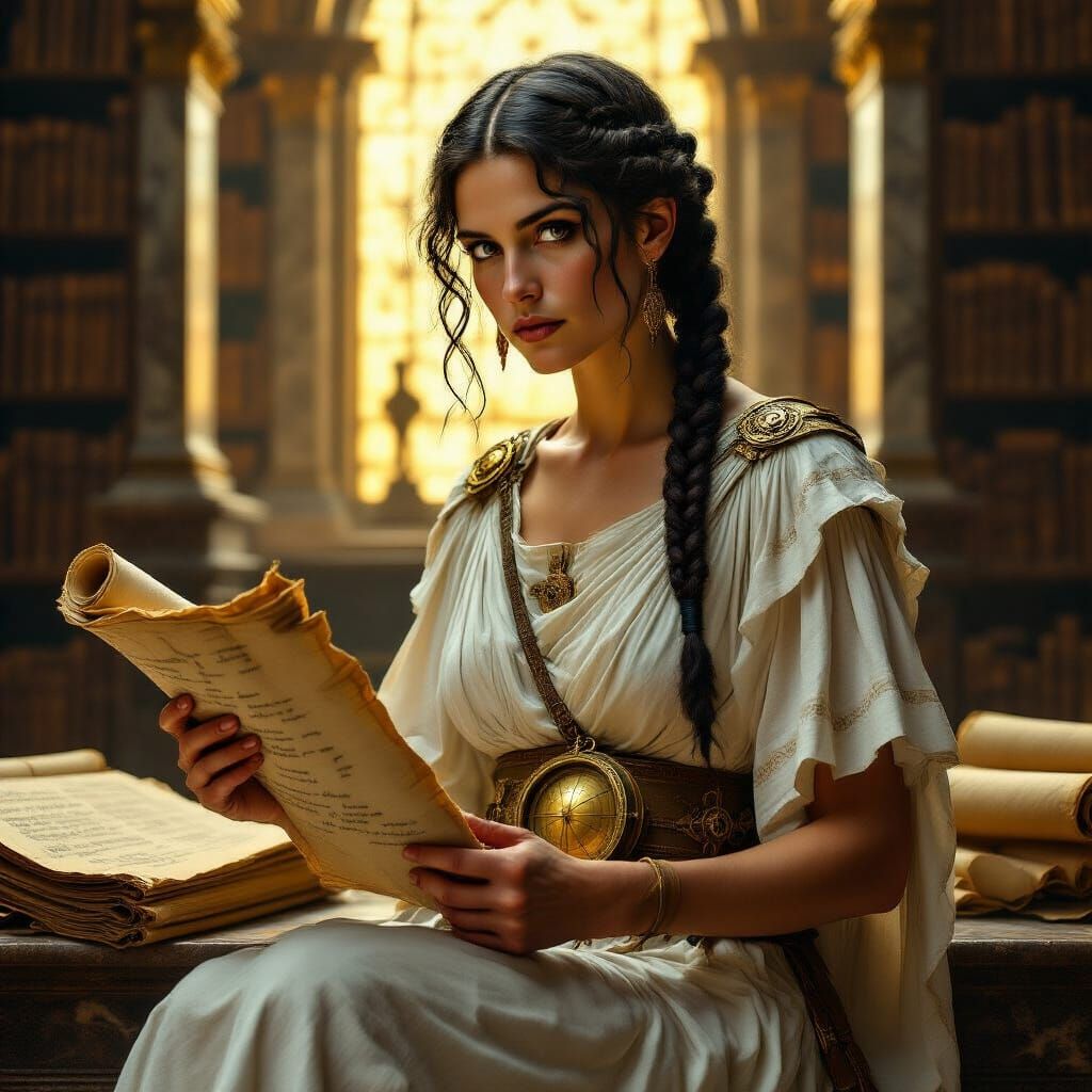 This image shows a Roman woman with braided hair in a marble library. She is holding a parchment scroll and an astrolabe, illuminated by golden light in a hyperrealistic style.