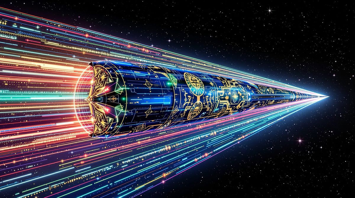 A hyper-realistic, 8k cinematic illustration of a sleek, fast interstellar starship. The vessel features glowing panels in blues, greens, and reds, with ornate golden cosmic patterns, set against a star-filled black space.
