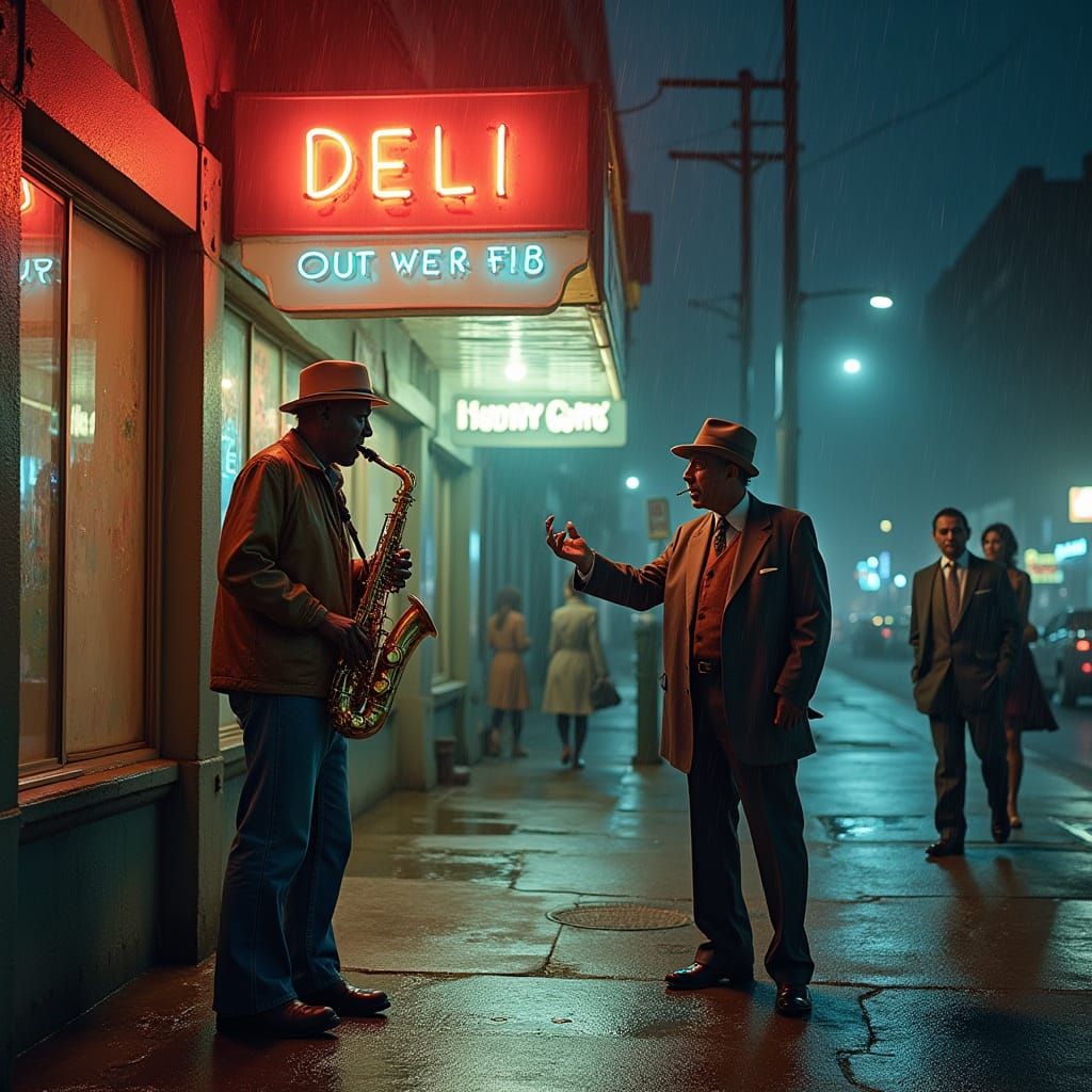 A vibrant street scene in 1970s Harlem, featuring a saxophonist in a worn leather jacket, surrounded by the neon glow of a deli sign, amidst a rainy night atmosphere, with influences from African American art movements.