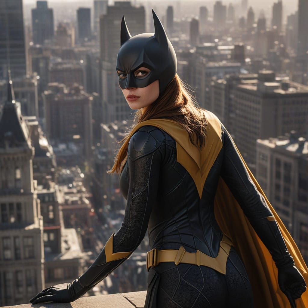 This image shows Batgirl scaling a Gotham City building. The scene is rendered as hyper-realistic digital art with a cinematic feel and comic book realism.