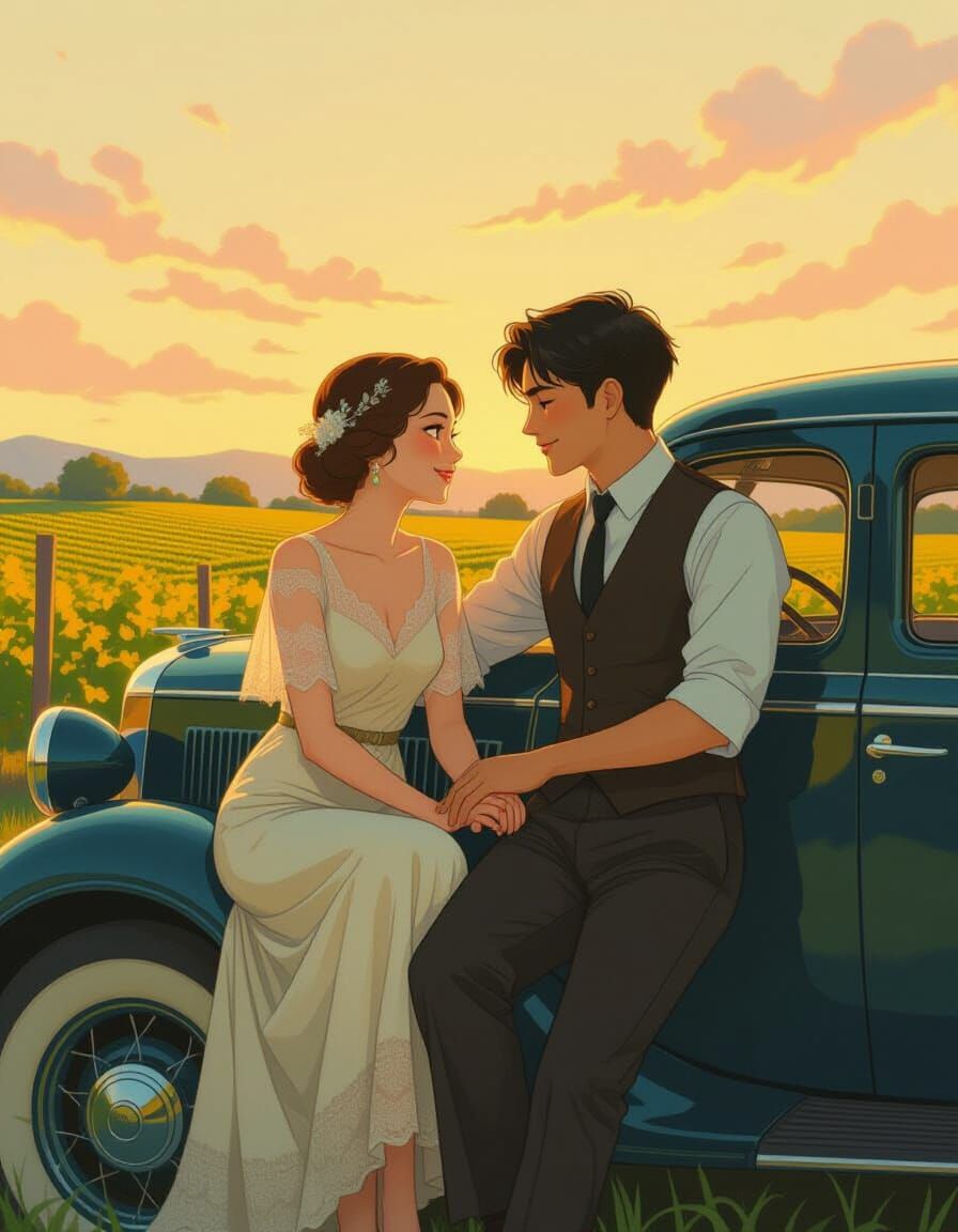 This image shows a couple in 1920s attire sharing a moment by a vintage car. Set within a lush vineyard at sunset, the scene is rendered in an anime style with cinematic lighting and a nostalgic color palette.