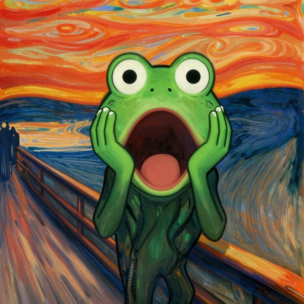 A vibrant cartoon character, resembling a frog, mimics 'The Scream' with hands on cheeks and an open mouth against a dramatic, swirling sky. Rendered in a bold, high-contrast meme coin style.