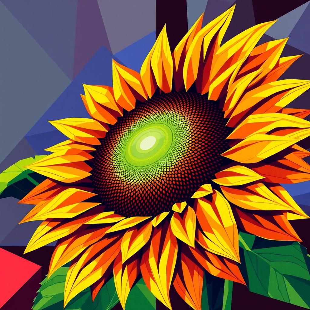 A striking picture of a sunflower created from geometric pixels. The image blends neo-cubist and art deco elements with a vibrant, high-contrast color palette in a maximalist digital art style.