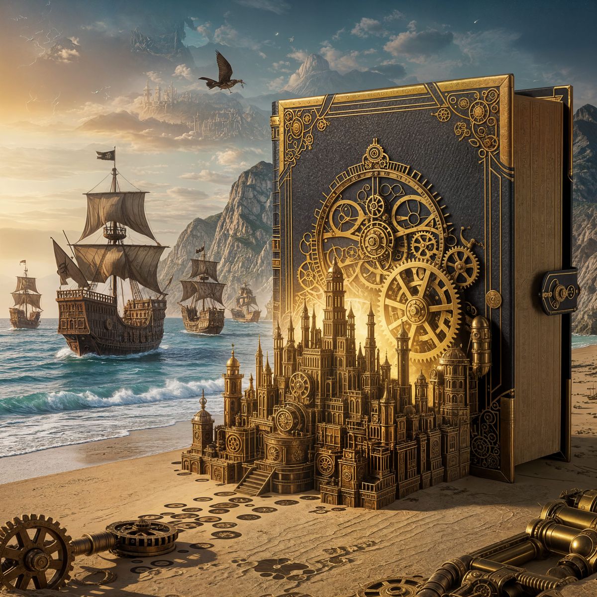 Steampunk Fantasy Golden Book with Pirate Ships and City