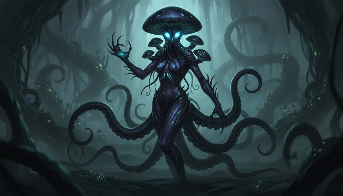 This image features sinister monster women with tentacles and unique mushroom-shaped eyes, rendered in a sleek, dark aesthetic.