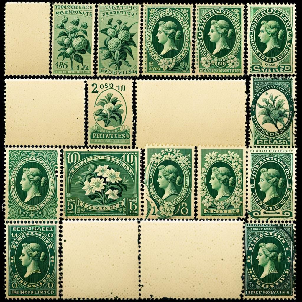 This image shows organized, vintage, green-toned antique postage stamps featuring floral designs. The stamps are perforated, monochromatic, and evoke a late 19th-century aesthetic.