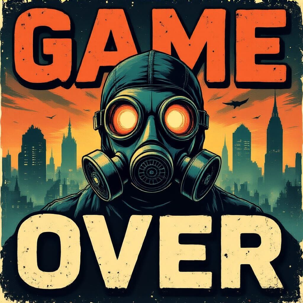 A retro-style album cover featuring a gas mask against a dark, futuristic city backdrop. The artwork is designed with a vintage horror aesthetic and bold, science fiction-inspired typography.