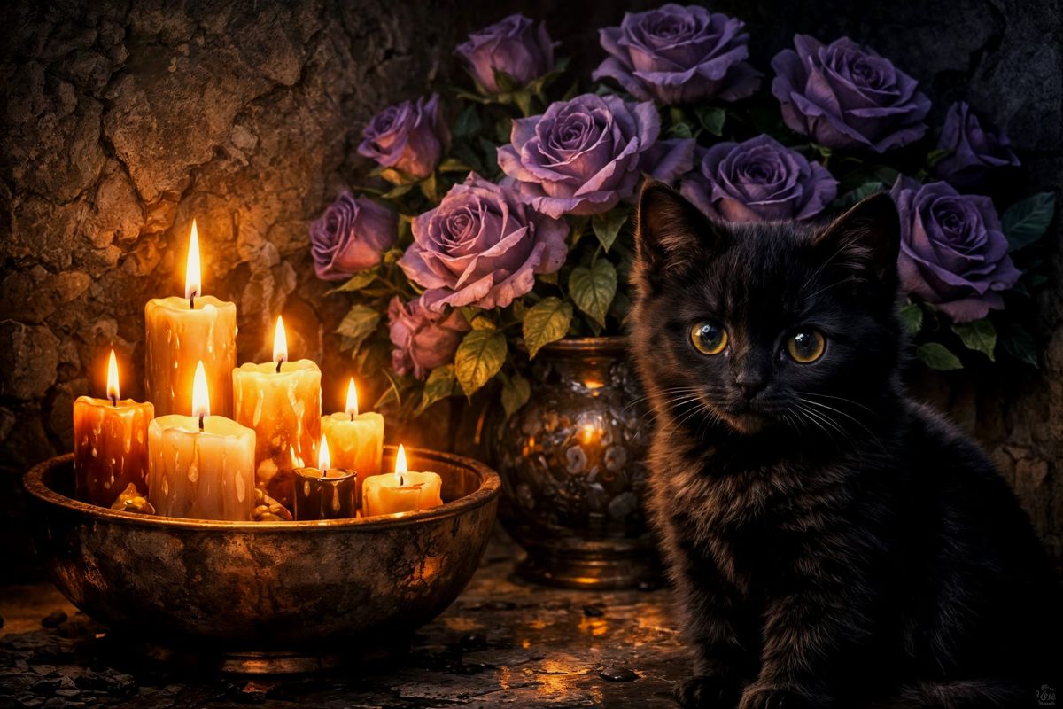 This 3D digital illustration features a black kitten near purple roses and burning candles. Warm light contrasts with deep shadows on rough stucco walls, creating a dramatic scene.