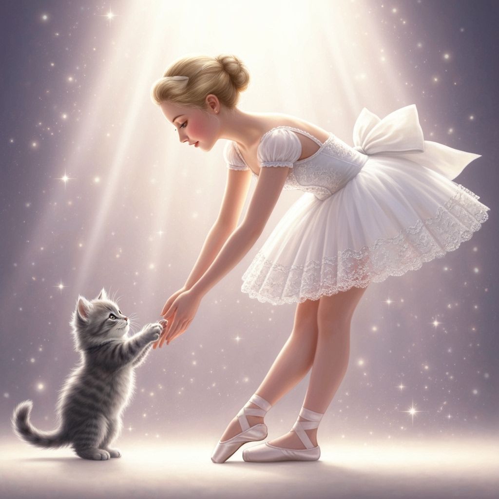 A tender scene of a young ballerina in a white lace dress and a gray kitten, rendered in a soft, romantic, and magical style with diffused lighting.