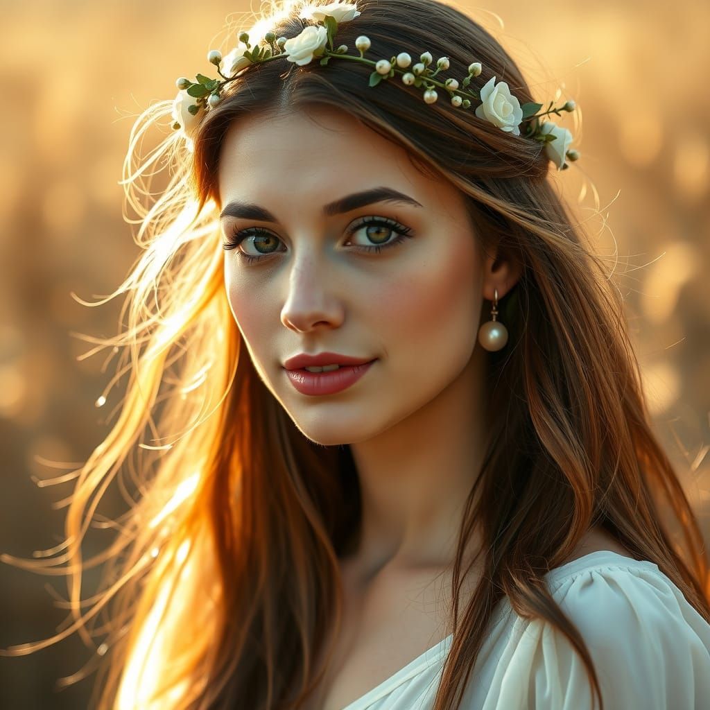 This image shows a serene woman with flowing chestnut hair and hazel eyes, adorned with pearl earrings and a floral crown, in soft golden sunlight. The portrait evokes an Art Nouveau aesthetic.