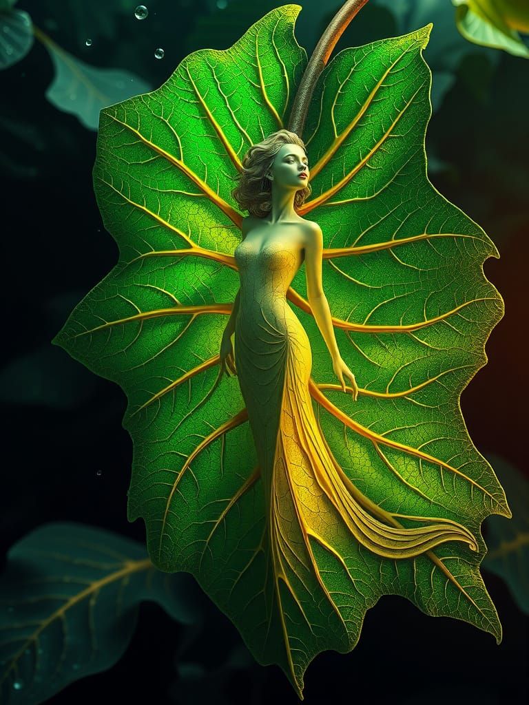 This image shows a woman formed from an ornate emerald leaf with a metallic gold structure. Photorealistic droplets and fantasy lighting enhance the surreal, dreamlike botanical design.