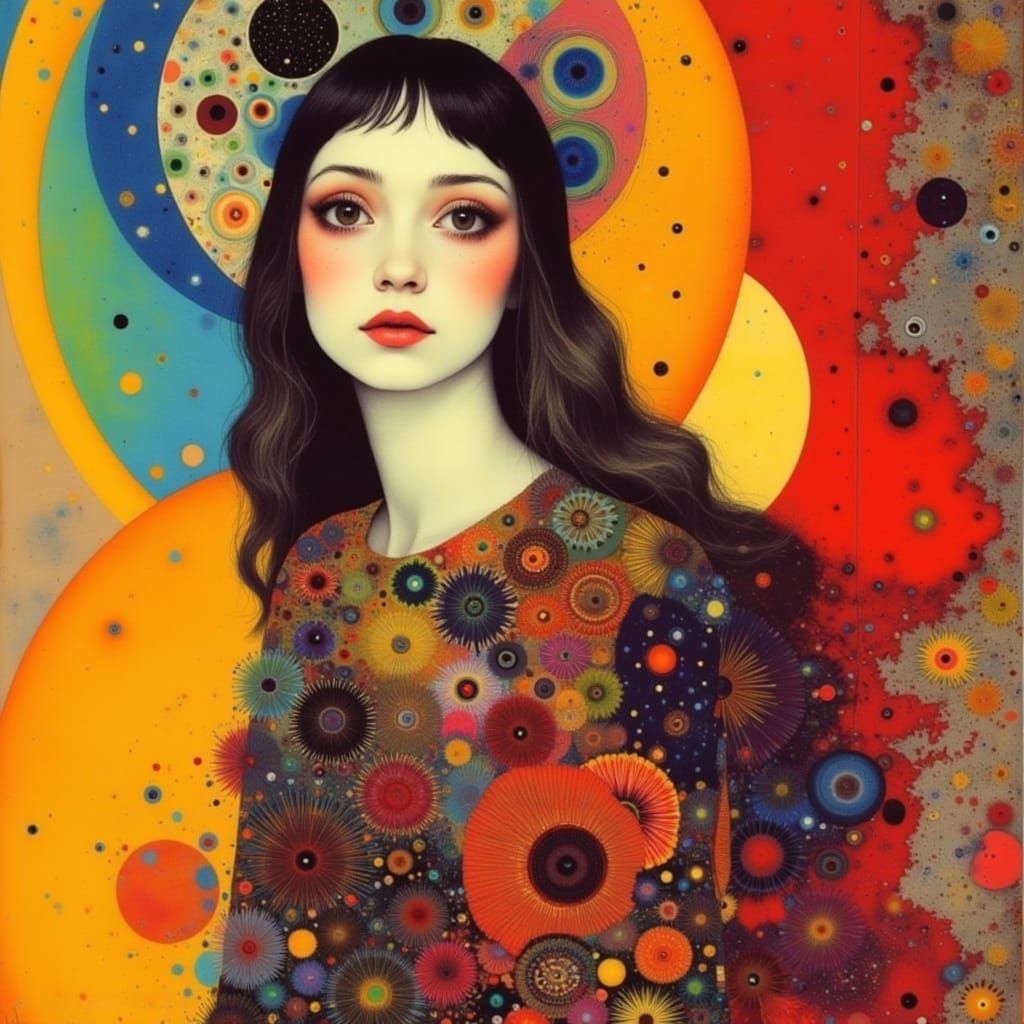 This vibrant digital art piece depicts Mother Nature as a hippie woman amidst a kaleidoscope of colorful planets, stars, and a celestial sky, blending elements of expressionism, pop art, and geometric Bauhaus style.