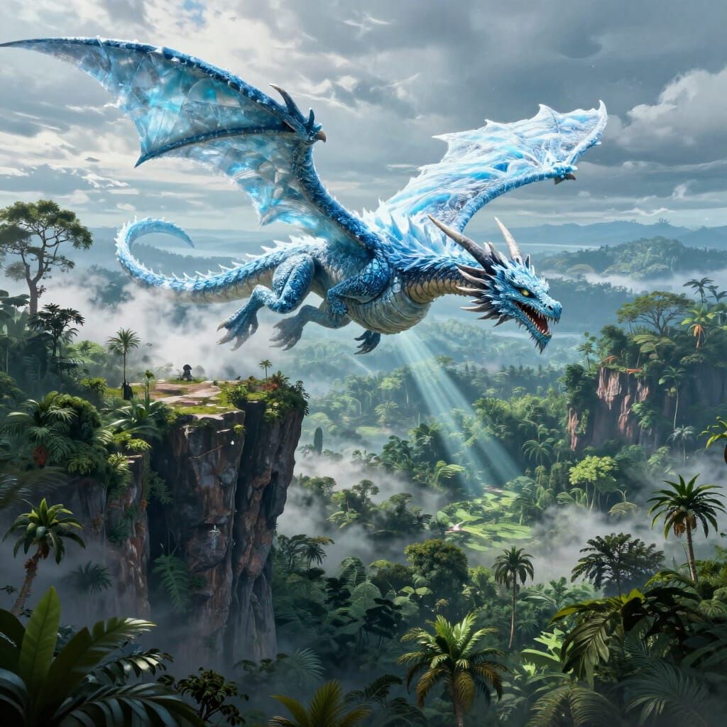 This image showcases a majestic ice dragon emerging from a cliff above a vast Amazon rainforest. Created in a cinematic digital matte painting style, it features intricate details and a vibrant color palette with dramatic lighting.