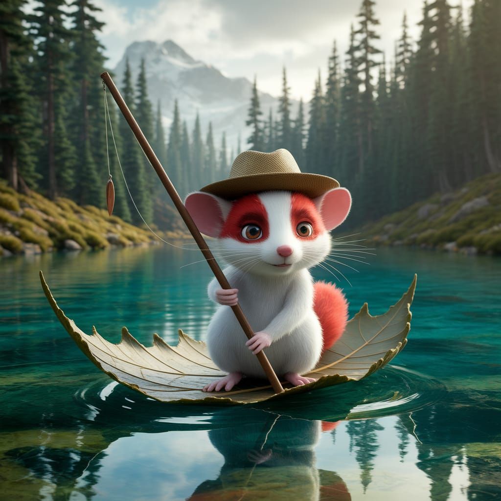 This image shows a whimsical hybrid creature, a cross between a mouse and fox, sailing on a leaf in a clear lake. The cinematic image features film grain and atmospheric lighting.