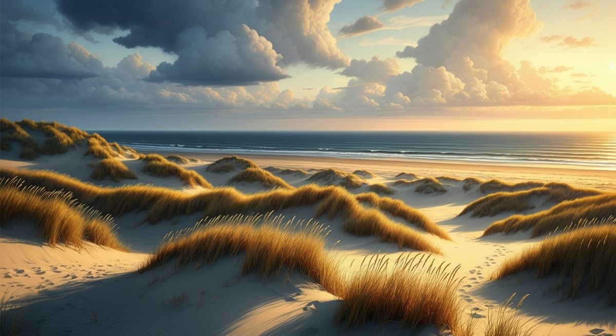 This serene coastal landscape at sunset features undulating sand dunes, a pristine beach, and a calm ocean, set against a dramatic sky with billowing cumulus clouds. The image is rendered in a highly detailed, painterly style with bold brushstrokes and textures, evoking a tranquil yet melancholic atmosph...