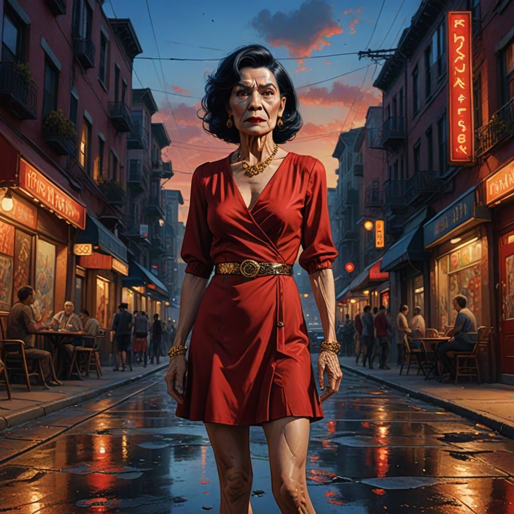 This fantasy artwork depicts an elderly transvestite in a stunning red mini dress, set against a vibrant blue city street backdrop. The subject's grey hair is dyed black, and their face is adorned with heavy makeup, accentuating deep wrinkles. The scene is bathed in warm golden hour lighting, with intric...