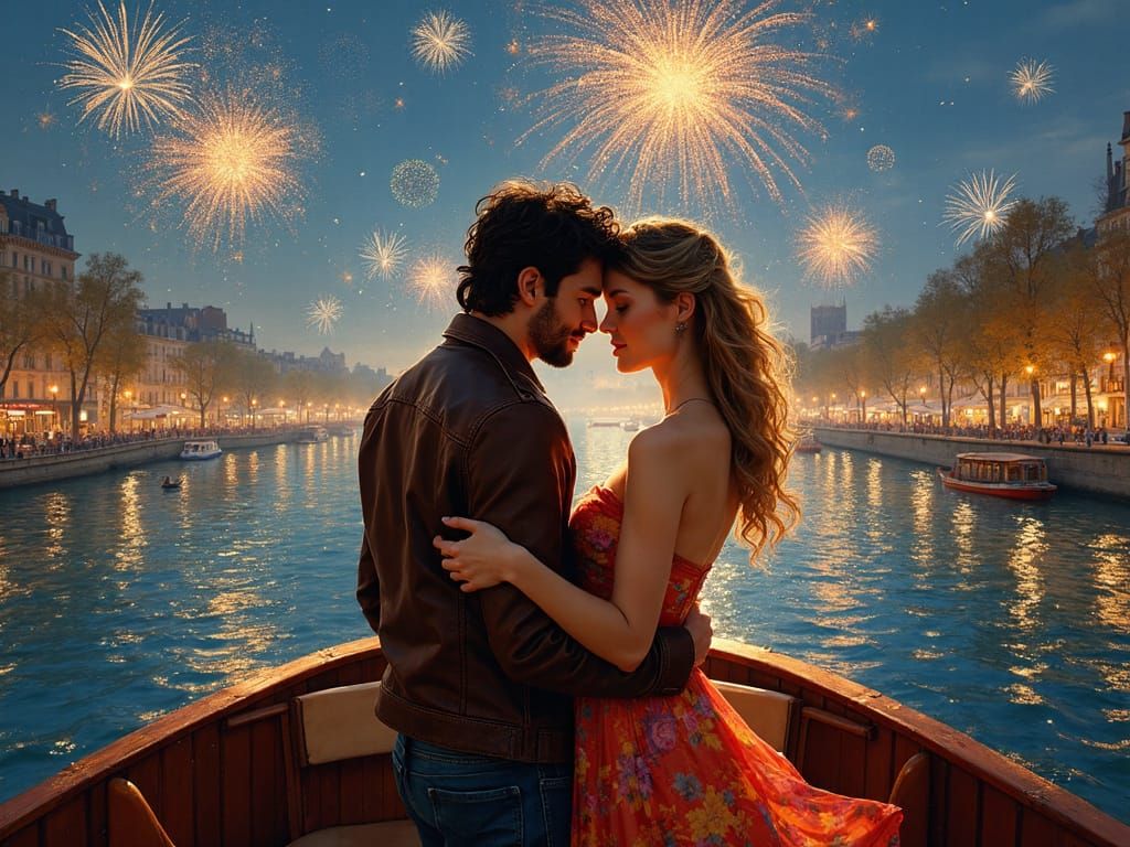 A picture capturing a man and woman embracing on a houseboat in Paris. Fireworks light up the sky in this image evoking impressionistic painting and romantic photography.