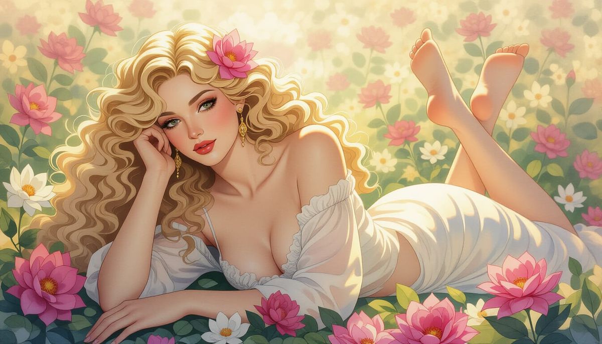 A watercolor and ink illustration of a beautiful woman with blonde hair reclining amongst flowers. The artwork features a warm color palette and ethereal, dreamy qualities in a sensual style.