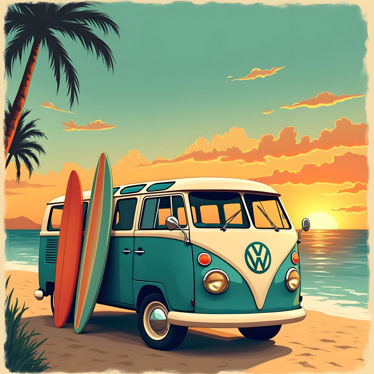 A vintage VW camper van stands silhouetted on a beach as the sun sets. Surfboards lean against the van in this image with bold lines and a vintage aesthetic.