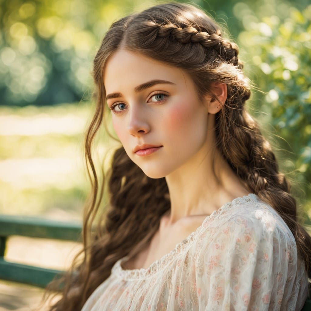 A serene portrait of a 20-year-old pregnant brunette, captured in soft, dreamy colors with loose strands of hair framing her face, evoking a sense of warmth and tranquility reminiscent of 19th-century Impressionist art.